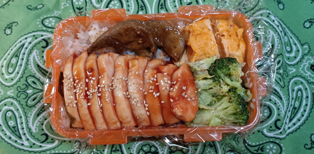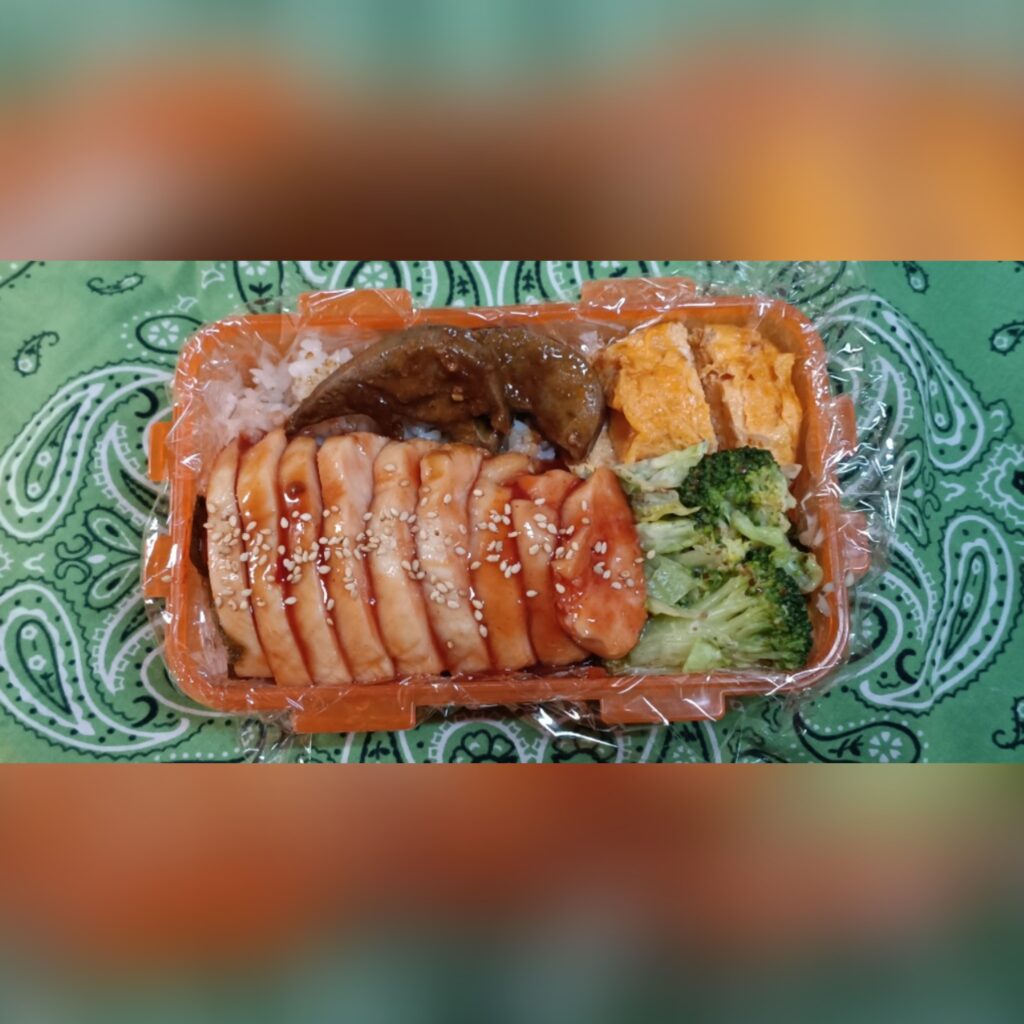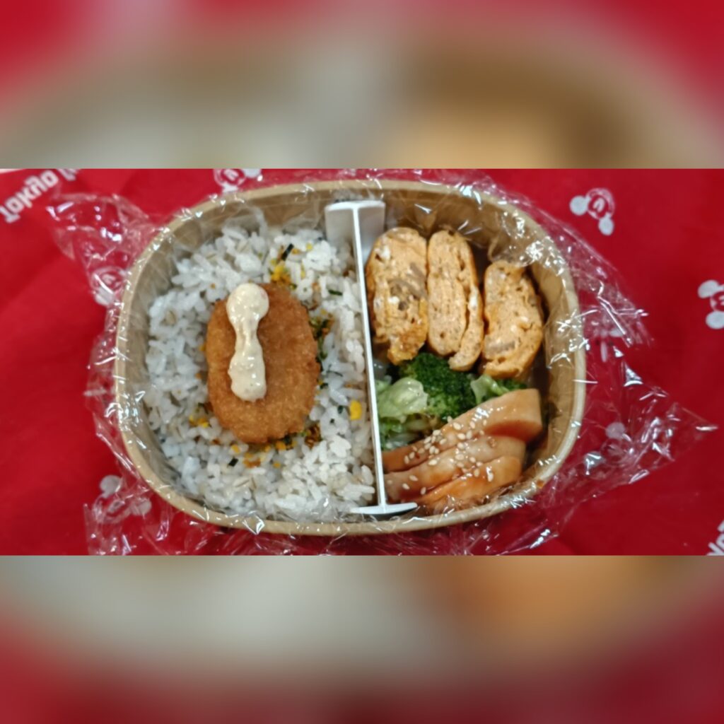 サーモンメンチカツ、なめ茸入り玉子焼き、ごまドレッシング味のブロッコリーとレタス、鶏むね肉