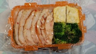 なめ茸入り玉子焼き、鶏むね肉113g、焙煎ごまドレッシング味のブロッコリーもち麦入りご飯150g(^Q^)