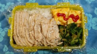 桜えび入り玉子焼き、鶏むね肉120g、ごまドレッシング味のブロッコリーご飯200gサーモンメンチカツ、桜えび入り玉子焼き、ごまドレッシング味のブロッコリー、鶏むね肉ご飯120g(^Q^)