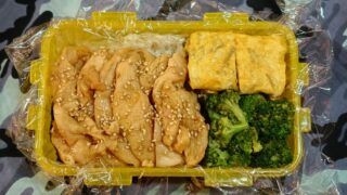 カニカマ入り玉子焼き、鶏むね肉117g、焙煎ごまドレッシング味のブロッコリーもち麦入りご飯150g(^Q^)