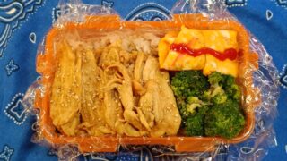 カニカマ入り玉子焼き、鶏むね肉124g、焙煎ごまドレッシング味のブロッコリーもち麦入りご飯150g(^Q^)