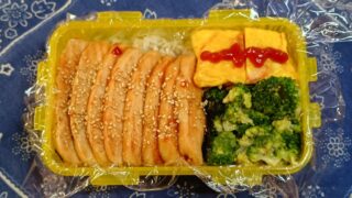 カニカマ入り玉子焼き、鶏むね肉123g、深煎ごまドレッシング味のブロッコリーもち麦入りご飯150g(^Q^)