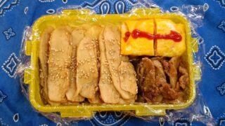 なめ茸入り玉子焼き、鶏むね肉120g、深煎ごまドレッシング味のブロッコリーご飯150g(^Q^)