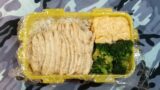 エビフライ、茹で卵、ポキポキウインナー、きざみねぎ入り玉子焼き、豚三枚肉スライスとブロッコリー極上スパイス喜。