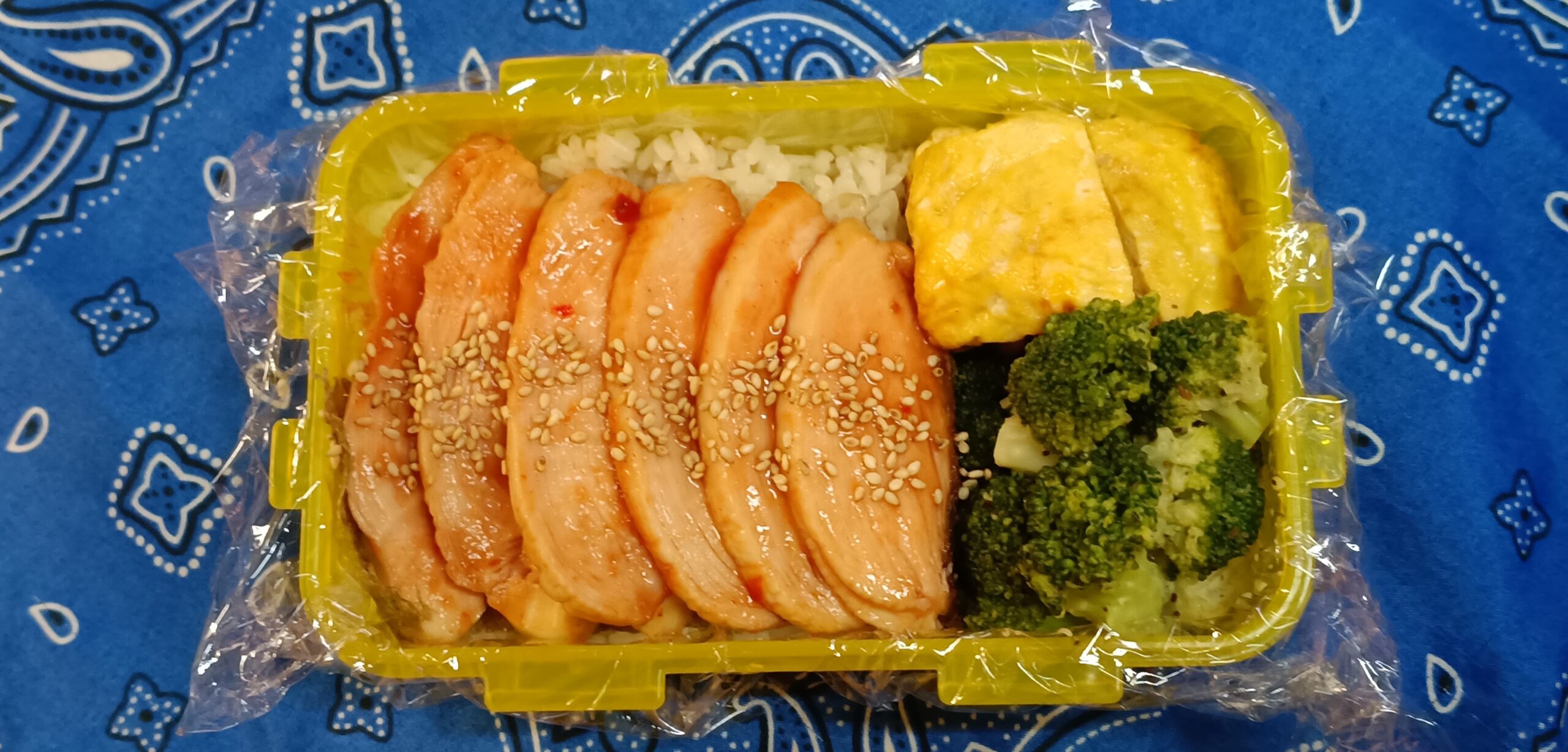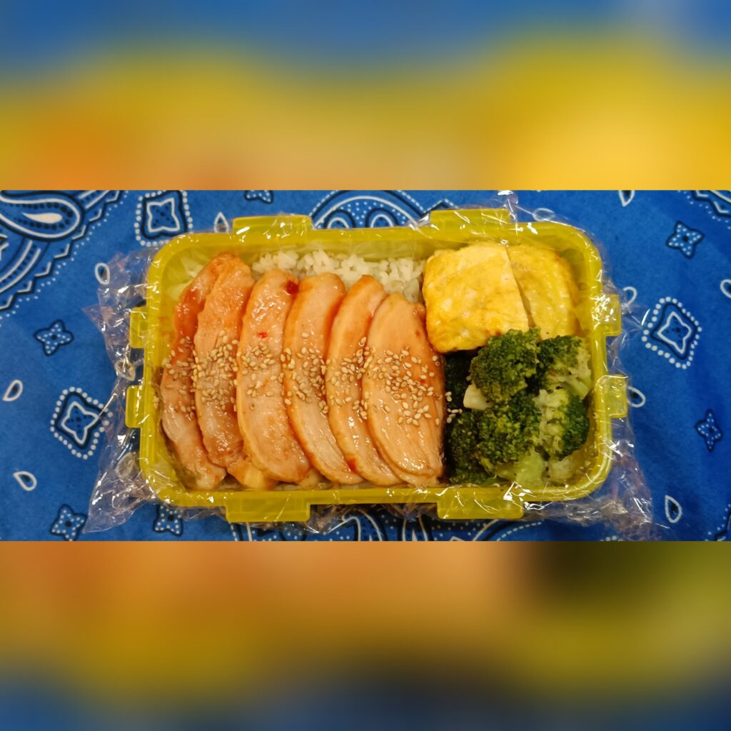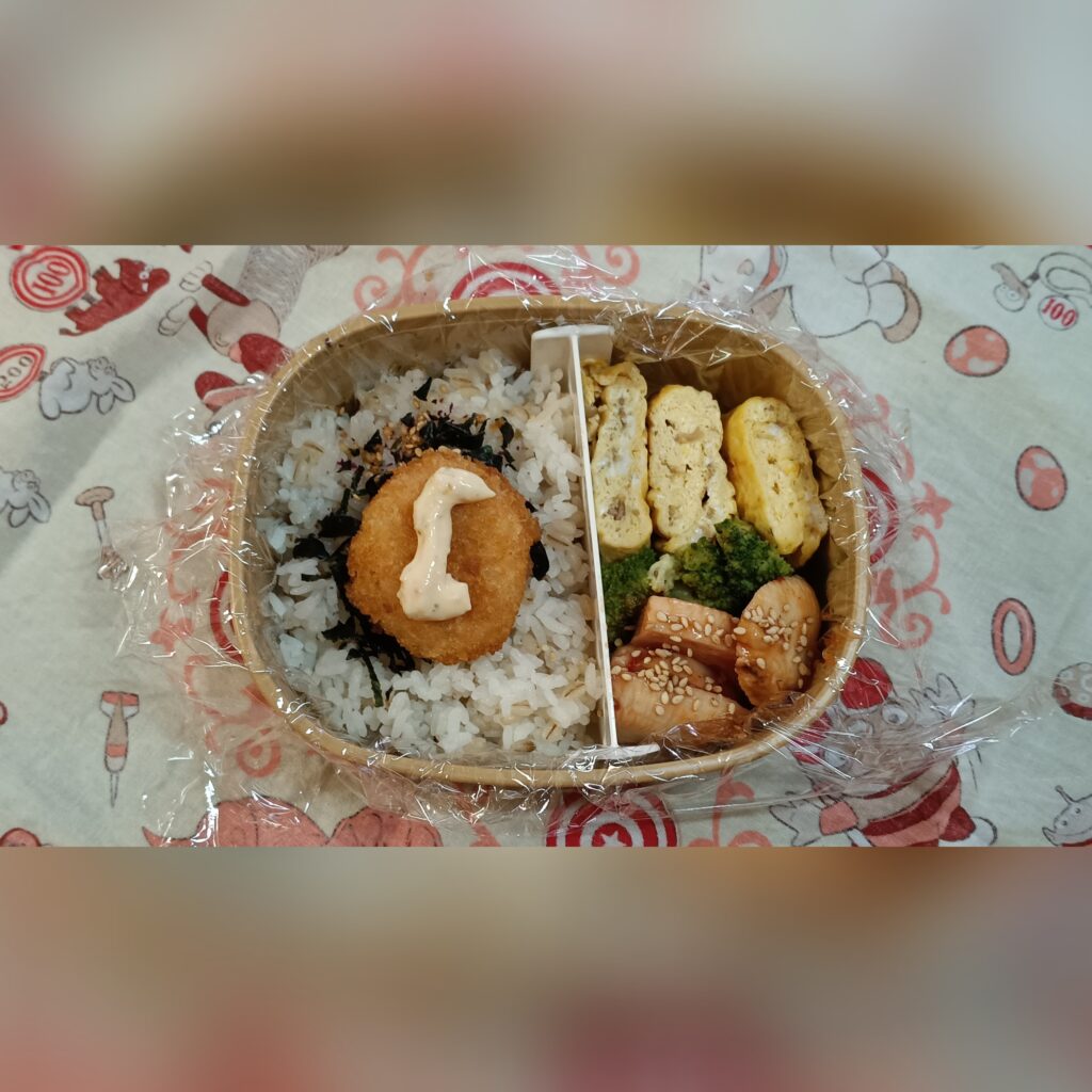今日のお弁当 ☆忘月忘日☆ Twitter Facebook はてブ Pocket LINE コピー 2025.10.14 なめ茸入り玉子焼き、鶏むね肉113g、焙煎ごまドレッシング味のブロッコリーもち麦入りご飯200gえびカツ、なめ茸入り玉子焼き、焙煎ごまドレッシング味のブロッコリー、鶏むね肉もち麦入りご飯120g(^Q^)