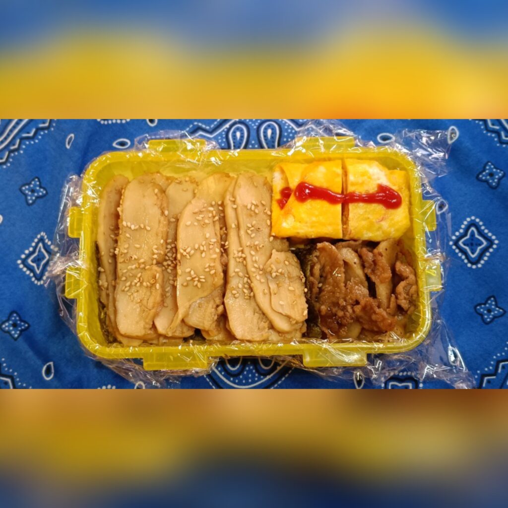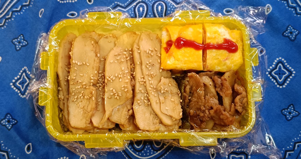 カニカマ入り玉子焼き、鶏むね肉118g、豚焼肉