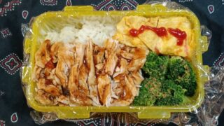 カニカマ入り玉子焼き、鶏むね肉115g、ごまだれ味のブロッコリーもち麦入りご飯150g(^Q^)