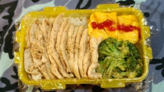 カニカマ入り玉子焼き、鶏むね肉120g、直火焙煎ごまドレッシング味のブロッコリーもち麦入りご飯200g(^Q^)